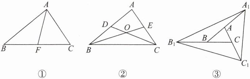 @@(2) $S_{\triangle BOC}=S_{四边形ADOE}$. 理由如下:∵ CD,BE 是△ABC 的中线,∴ $S_{\triangle BCD}=\frac{1}{2}S_{\triangle ABC}$,$S_{\triangle ABE}=\frac{1}{2}S_{\triangle ABC}$,∴ $S_{\triangle BCD}=S_{\triangle ABE}$,∴ $S_{\triangle BCD}-S_{\triangle BOD}=S_{\triangle ABE}-S_{\triangle BOD}$,即 $S_{\triangle BOC}=S_{四边形ADOE}$. (3) 如图,连接$AB_1,BC_1,A_1C$.∵ 点 C 为$AC_1$的中点,∴ $AC=CC_1$,∴ $S_{\triangle ABC}=S_{\triangle C_1CB}$,∵ 点 B 为$B_1C$的中点,∴ $B_1C=2BC$,∴ $S_{\triangle B_1C_1C}=2S_{\triangle C_1CB}$,∴ $S_{\triangle B_1C_1C}=2S_{\triangle ABC}=2$. 同理可得,$S_{\triangle A_1B_1B}=S_{\triangle A_1AC_1}=2S_{\triangle ABC}=2$,∴ $S_{\triangle A_1B_1C_1}=2+2+2+1=7$.