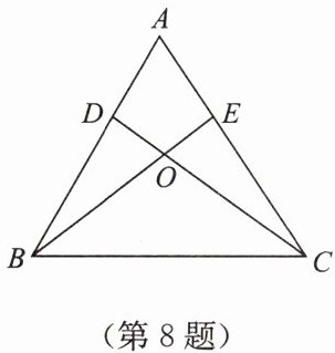 8. 如图,△ABC的两条高BE,CD相交于点O,且OB= OC,∠A= 60°。