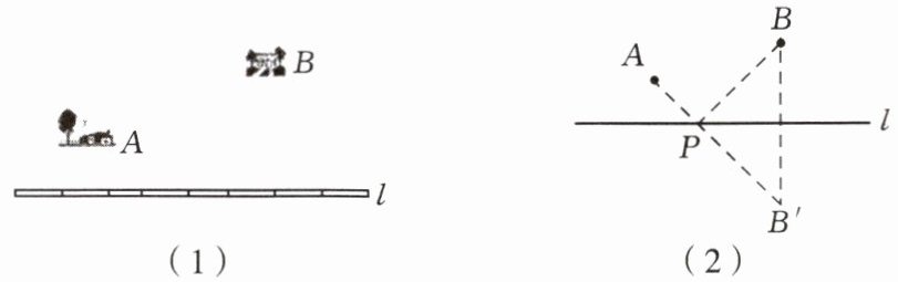 聪明的小华通过独立思考,很快得出了解决这个问题的正确办法。他把管道 $ l $ 看成一条直线(如图(2)),问题就转化为,要在直线 $ l $ 上找一点 $ P $,使 $ AP $ 与 $ BP $ 的和最小。他的作法是这样的: