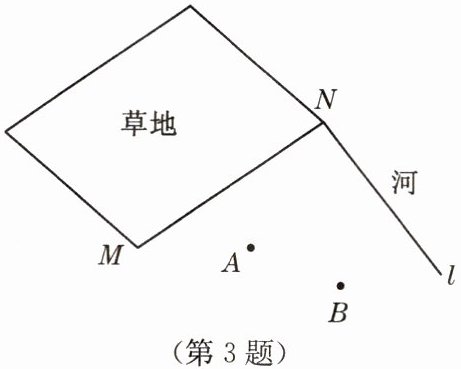 3. 如图,$ A $ 为马厩,$ B $ 为帐篷,牧马人某一天要从马厩牵出马,先到草地边 $ MN $ 某一处牧马,再到河边 $ l $ 某一处饮马,然后回到帐篷。请你在图中帮他确定这一天的最短路线。