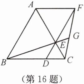 16. 如图,已知 $ \triangle ABC $ 是等边三角形,点 $ D $,$ E $ 分别在边 $ BC $,$ AC $ 上,且 $ CD = CE $,连接 $ DE $ 并延长至点 $ F $,使 $ EF = AE $,连接 $ AF $,$ CF $,连接 $ BE $ 并延长交 $ CF $ 于点 $ G $。下列结论: