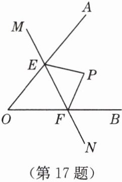 17. (4 分)如图,已知点 $ P $ 在 $ \angle AOB $ 内,点 $ M $,$ N $ 分别是点 $ P $ 关于 $ OA $,$ OB $ 的对称点,连接 $ M $,$ N $ 分别交 $ OA $,$ OB $ 于 $ E $,$ F $,若 $ \triangle PEF $ 的周长为 15,求 $ MN $ 的长。