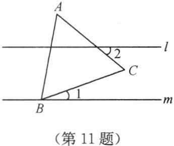 11. 如图,$ l // m $,等边 $ \triangle ABC $ 的顶点 $ B $ 在直线 $ m $ 上,$ \angle 1 = 20^{\circ} $,则 $ \angle 2 = $