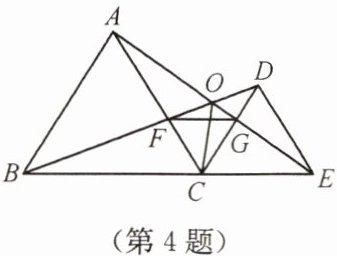 4. 如图,已知$\triangle ABC和\triangle CDE$均是等边三角形,点 $B$,$C$,$E$ 在同一条直线上,$AE$ 与 $BD$ 交于点 $O$,$AE$ 与 $CD$ 交于点 $G$,$BD$ 与 $AC$ 交于点 $F$,连接 $OC$,$FG$,则下列结论:(1)$AE = BD$;(2)$AG = BF$;(3)$\angle BOC = \angle EOC$。其中正确的结论个数是(