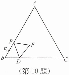 10. 如图,在等边$\triangle ABC$中,$AB = 10$,$BD = 4$,$BE = 2$,点 $P$ 从点 $E$ 出发沿 $EA$ 方向运动,连接 $PD$,以 $PD$ 为边,在 $PD$ 右侧按如图方式作等边$\triangle DPF$,当点 $P$ 从点 $E$ 运动到点 $A$ 时,点 $F$ 运动的路径长是(