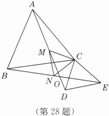 28. ($16$ 分)已知:如图,$\triangle ABC$,$\triangle CDE$ 都是等边三角形,$AD$,$BE$ 相交于点 $O$,点 $M$,$N$ 分别是线段 $AD$,$BE$ 的中点。