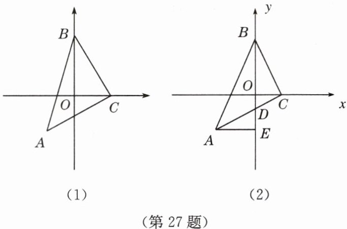 27. ($12$ 分)如图,$\triangle ABC$ 是等腰直角三角形,$BC = AC$,直角顶点 $C$ 在 $x$ 轴上,一锐角顶点 $B$ 在 $y$ 轴上。