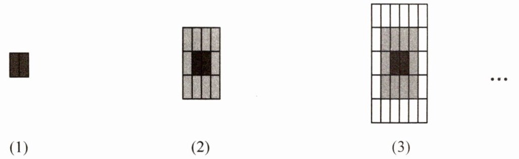 问题 某体育馆用大小相同的长方形木块镶嵌地面,第 1 次铺 2 块,如图(1);第 2 次把第 1 次铺的完全围起来,如图(2);第 3 次把第 2 次铺的完全围起来,如图(3)……依此方法,第 $n$ 次铺完后,用字母 $n$ 表示第 $n$ 次镶嵌所使用的木块数为