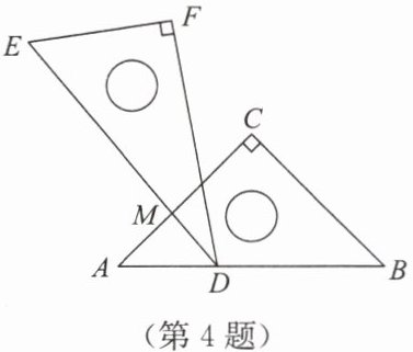 4. 如图,一副三角板叠在一起,最小锐角的顶点$D恰好放在等腰直角三角板ABC的斜边AB$上,$AC与DE交于点M$,如果$\angle BDF = 105^{\circ}$,则$\angle AMD$的度数为(