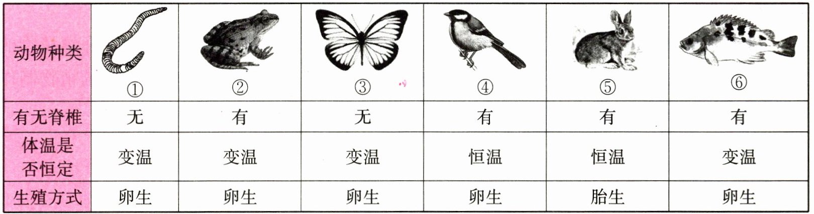 问题 某校生物学兴趣小组的同学们收集了蚯蚓、青蛙、蝴蝶、大山雀、家兔、鳜鱼这六种动物的相关资料,并对它们进行分类(如下表所示),请据表回答问题。