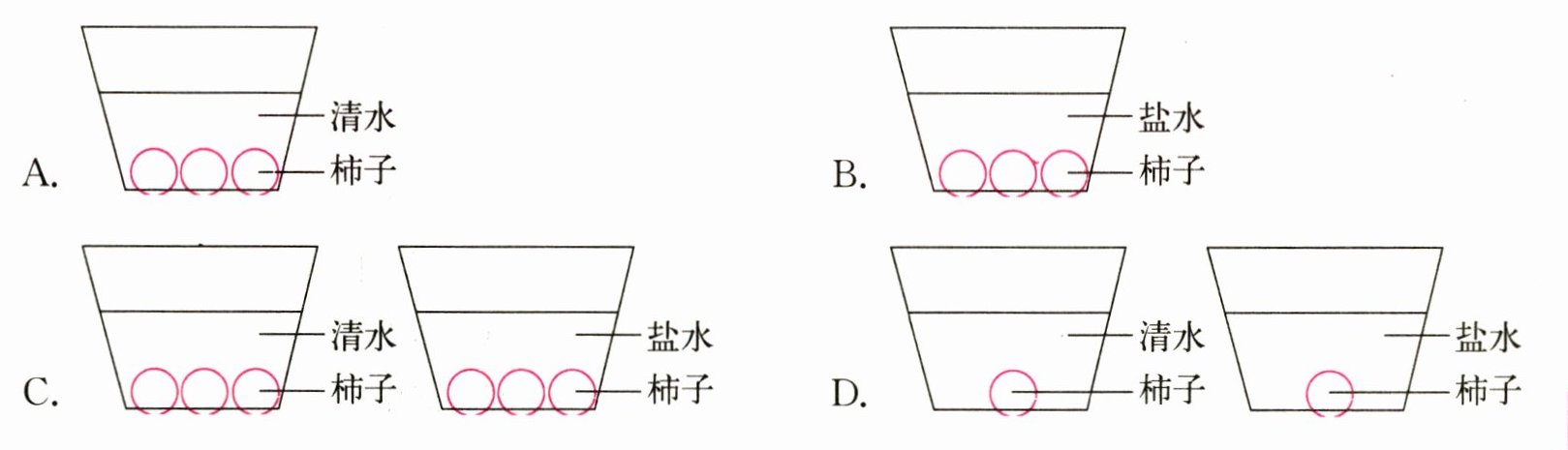 9. 下列实验设计中,能探究柿子在清水或盐水中哪个更易脱涩的是(