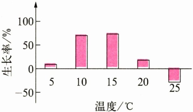 问题 海带的生长与生活环境密切相关,某研究小组探究了水体温度对海带生长率(生长率是指实验前后,体内物质增加的比率)的影响(见下图),请分析实验数据(25℃时海带腐烂,生长率为负值)并回答问题。