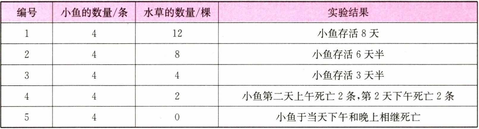 问题 下表所示的是某校生物学兴趣小组的同学们研究一个小型生态系统中动物数量和植物数量关系的实验数据。实验中使用了以下实验用具:有盖玻璃瓶、小鱼、水草、沙子(含少量淤泥)、经纱布过滤的池水。同学们把 5 个生态瓶均放在实验室窗台上,并使它们所处环境中的非生物因素相同且适宜。