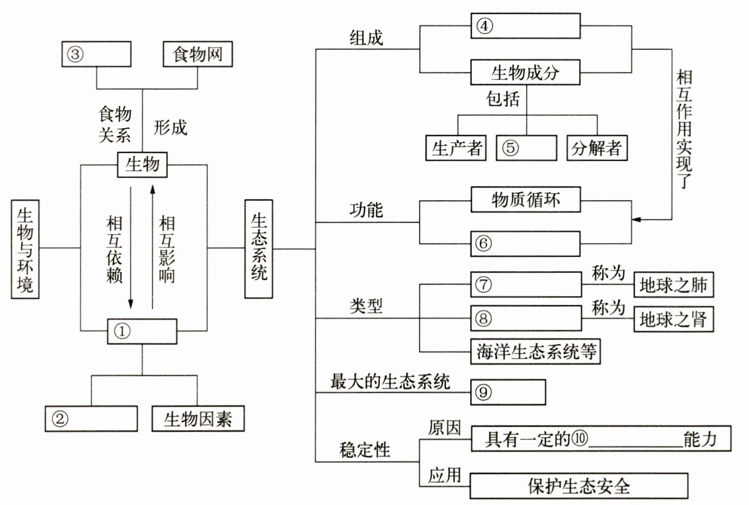 答案:1.①环境 ②非生物因素 ③食物链 ④非生物成分 ⑤消费者 ⑥能量流动 ⑦森林生态系统 ⑧湿地生态系统 ⑨生物圈 ⑩自我调节