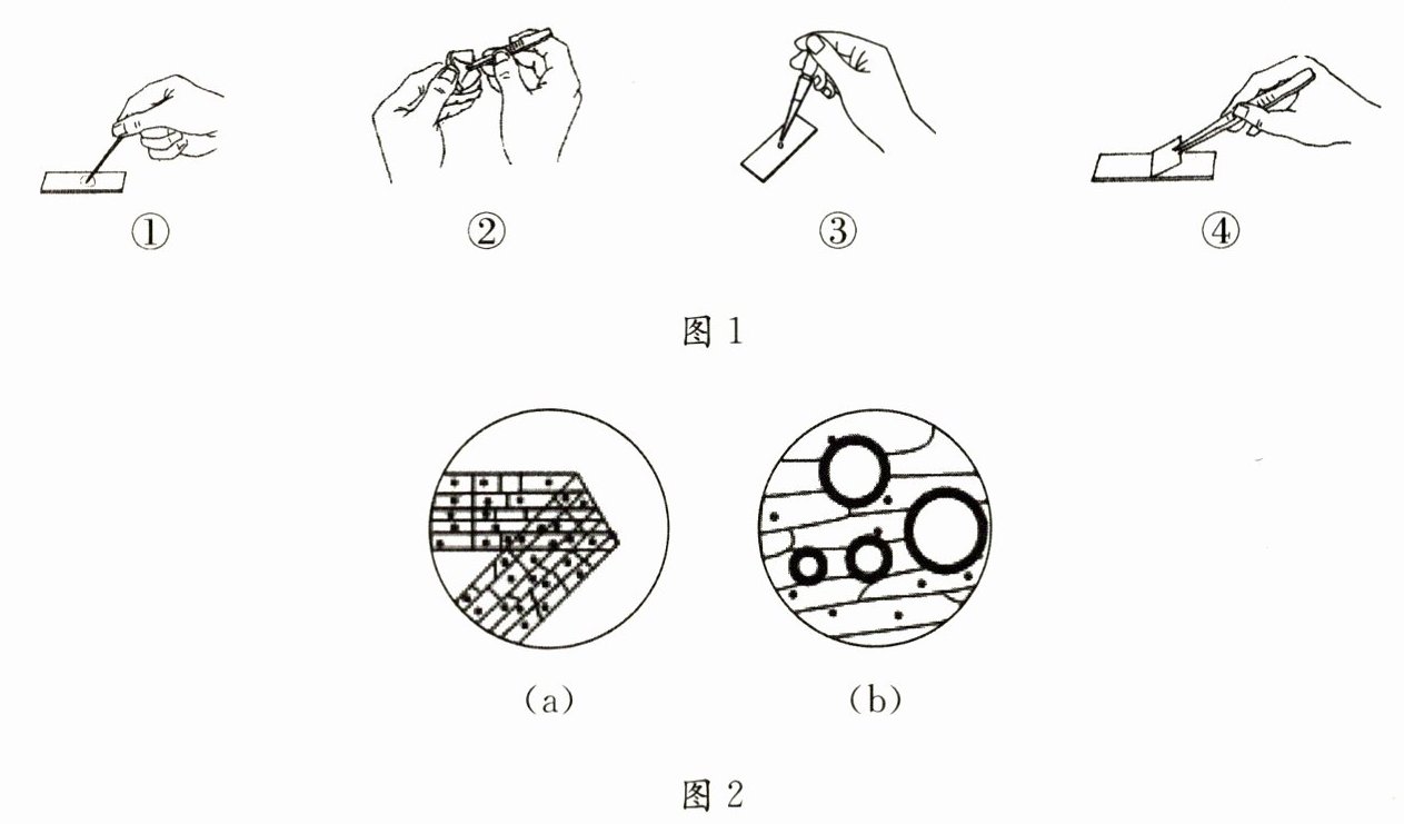 某校生物学兴趣小组的同学们在观察洋葱鳞片叶内表皮细胞后,想再观察紫色的洋葱鳞片叶外表皮细胞。图 1 是制作洋葱鳞片叶外表皮细胞临时装片步骤示意图,图 2 所示的是在光学显微镜下看到的(a)和(b)两个视野,请据图回答问题。