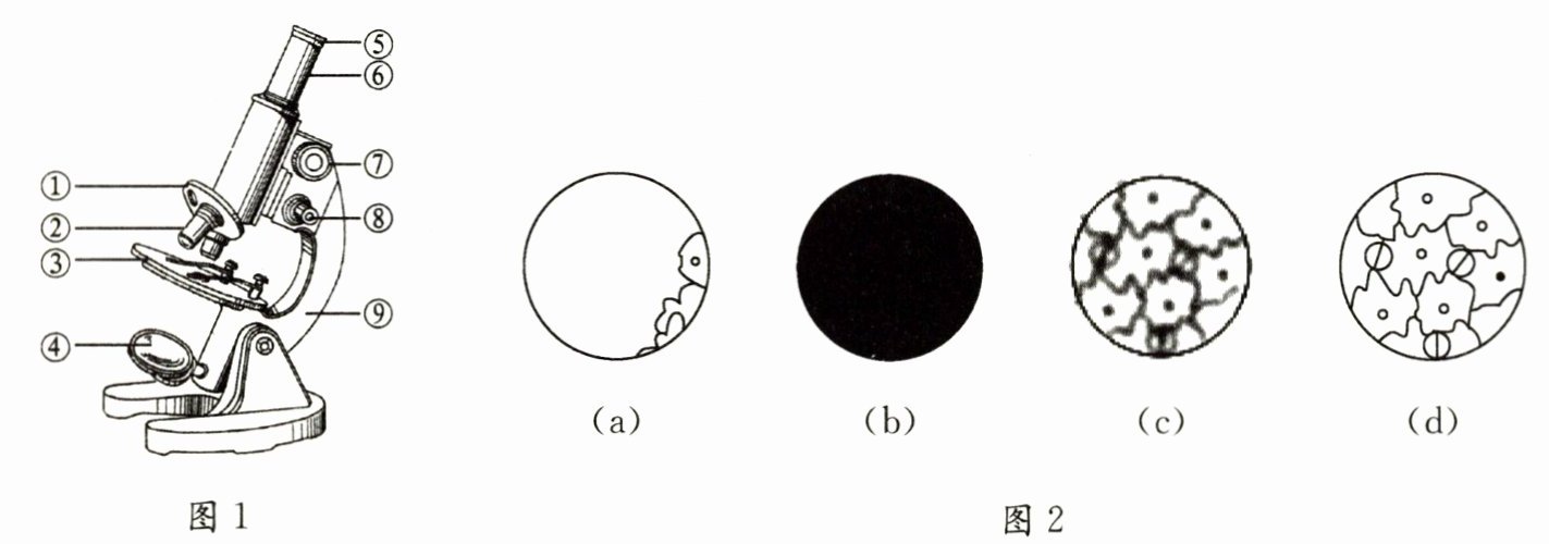某校生物学兴趣小组的同学们在学习规范使用单目显微镜后,对叶片的结构进行观察。图1是单目显微镜的结构示意图,图2所示的是生物学兴趣小组中的甲、乙、丙、丁四位同学使用单目显微镜观察叶片结构时看到的视野,请据图回答问题。