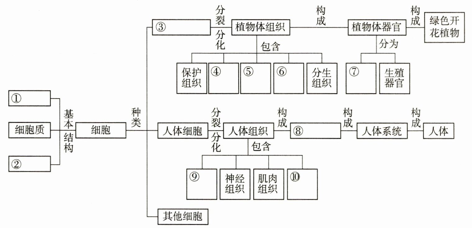 答案:1. ①细胞膜 ②细胞核 ③植物细胞 ④薄壁组织 ⑤输导组织 ⑥机械组织 ⑦营养器官 ⑧人体器官 ⑨上皮组织 ⑩结缔组织