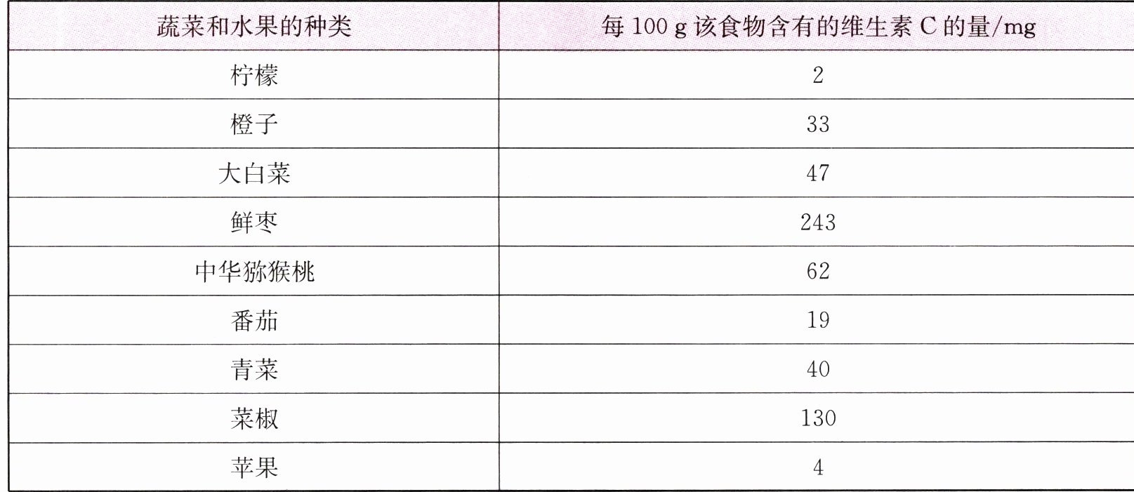 问题 某校生物学兴趣小组的同学对常见蔬菜和水果中的维生素 C 含量进行了检测,结果如下表所示。