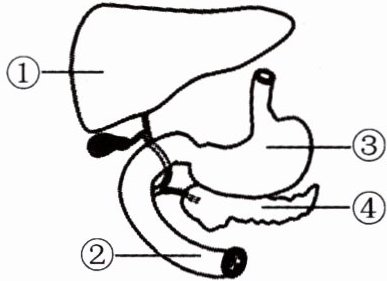 7. 人体的生命活动由多个系统共同协调完成。右下图为消化系统部分结构示意图,图中所示器官中,其分泌的消化液不含消化酶的是(