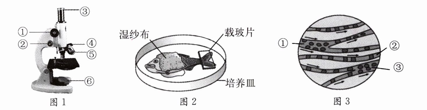 23. 在使用显微镜观察小鱼尾鳍血液流动时,图像模糊,若想更清楚地看到小鱼尾鳍中的血管及血液流动情况,可调节图 1 所示的显微镜中的(