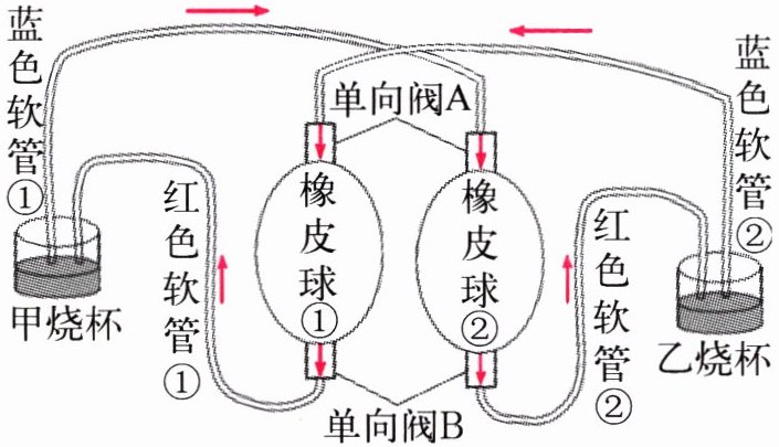 28. 下图所示的是某同学在校园科技节上的参赛作品——血液循环演示模型,其中单向阀模拟瓣膜,软管模拟与心脏相连的血管,装置内的红墨水模拟血液(箭头表示液体流动方向)。演示过程:①同时挤压两个橡皮球,红墨水从橡皮球经红色软管流出进入烧杯;②同时松开两个橡皮球,红墨水从烧杯经蓝色软管流入橡皮球。