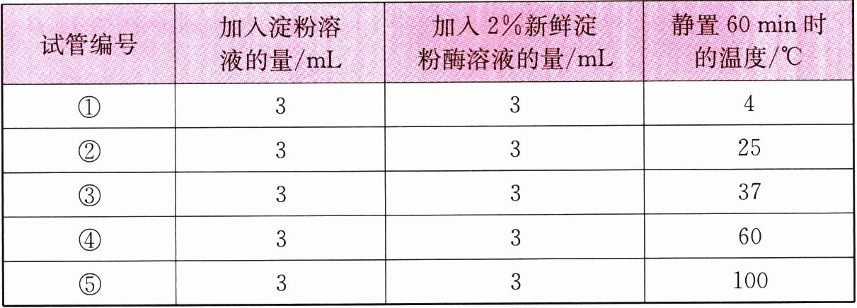 小明体温高热时,出现消化不良、食欲不振的症状。这是什么原因导致的呢?他在网上查到某校生物学兴趣小组的同学利用淀粉溶液探究“温度对淀粉酶活性的影响”的相关资料,受到了启发。该兴趣小组的实验处理如下表所示。各试管静置 60 min 后的实验结果如下图所示。请分析并回答问题。