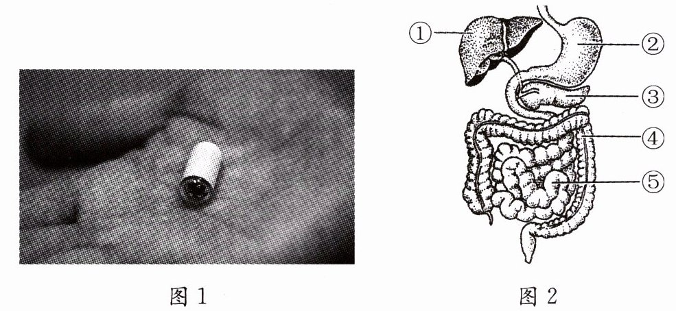 11. 图 1 所示的胶囊内窥镜是一种吞咽式小型设备,可以捕捉到消化道内的图像,用于诊断胃肠道疾病。图 2 是人体消化系统结构示意图。下列有关叙述中正确的是(