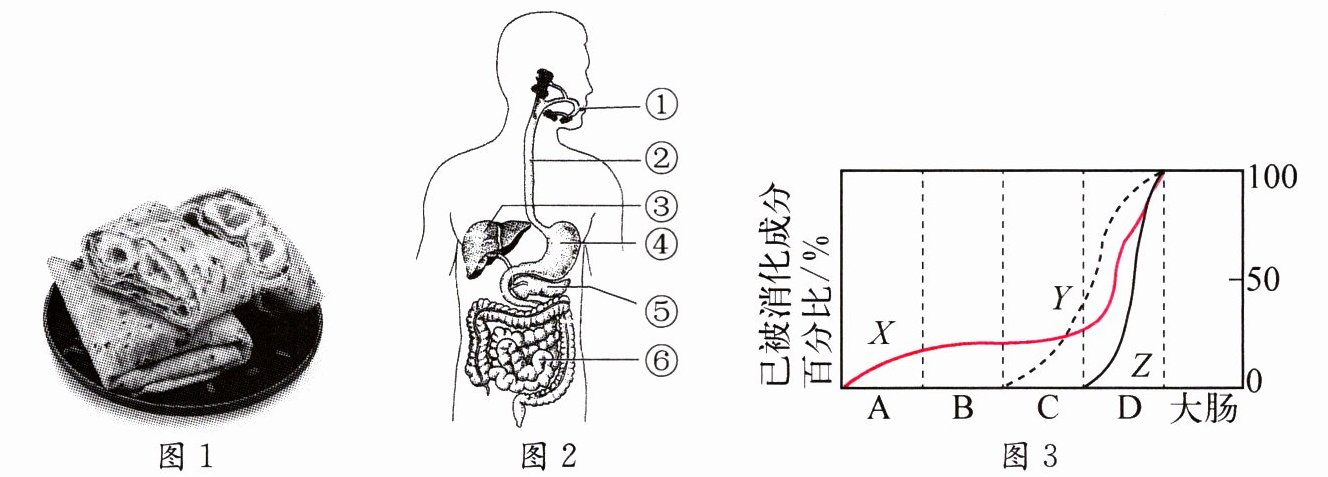 解析 本题旨在考查对消化系统结构和功能的理解,以及对食物消化过程中物质变化的认识,体现了生物学核心素养中的生命观念和科学思维。通过分析煎饼馃子的组成成分,将理论知识与实际生活相结合,理解消化过程的科学原理。煎饼中富含淀粉,味不甜。细嚼时,口腔中的唾液腺分泌的唾液中含有淀粉酶,淀粉被该酶初步分解成麦芽糖,麦芽糖有甜味。鸡蛋中的蛋白质在消化过程中被分解成氨基酸,这样才能被人体吸收利用。根据消化系统中各器官的结构特征,我们可以确定图 2 中①是口腔,②是食管,③是肝脏,④是胃,⑤是胰腺,⑥是小肠。胃是消化系统中对蛋白质进行初步消化的器官。图 3 中,A 代表口腔,B 代表食管,C 代表胃,D 代表小肠。馃子中的脂肪可以借助胆汁将其变成微小的颗粒。胆汁由肝脏分泌,可以促进脂肪的消化。通过分析图 3 中的曲线变化,我们可以得知:X 曲线表示淀粉,在口腔中已经开始消化;Y 曲线表示蛋白质,在胃中开始消化;Z 曲线表示脂肪,在小肠中才开始消化。图 3 中小肠位置显示三种营养物质都被进一步消化,且三种营养物质在此被消化的量也最多,说明小肠是消化食物的主要场所。小肠内壁有环形皱襞,皱襞上覆盖着小肠绒毛,这些绒毛内含毛细血管,小肠绒毛壁和毛细血管壁都很薄,这些特点都有利于营养成分的吸收。
