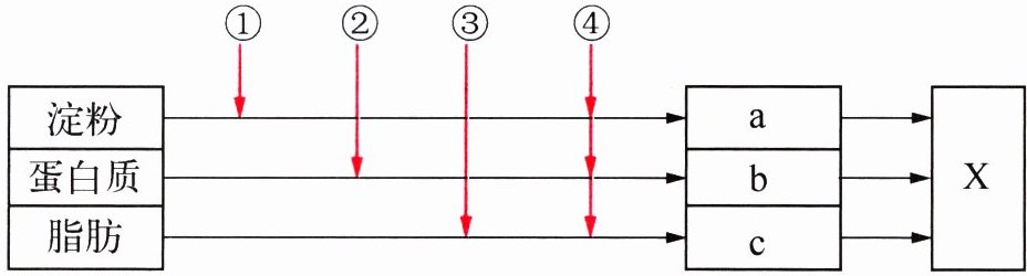 下图为人体消化、吸收的过程示意图。①~④表示不同的消化液,纵向箭头表示消化液对相应营养物质的消化作用,a、b、c 分别表示淀粉、蛋白质和脂肪的最终消化产物,X 表示消化道中某个器官。
