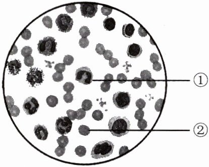 解析 本题通过“观察人的血细胞涂片”实验,既考查了生物学的结构和功能观,也考查了基于实验证据,进行比较、分析、归纳的核心素养。图中①是白细胞,白细胞都有细胞核,比红细胞数量少,具有防御和保护的作用。图中②是红细胞,内含一种红色含铁的蛋白质叫血红蛋白,因此红细胞呈红色。人和大多数哺乳动物成熟的红细胞里没有细胞核,呈两面凹的圆饼状,具有运输氧的功能。血小板的形状不规则,没有细胞核,是最小的血细胞,具有止血和凝血的功能。人的血液由血细胞和血浆组成,血细胞有红细胞、白细胞和血小板三种。人患某些疾病时,可能会引起血液成分发生异常变化,所以,医生经常将化验血液成分作为诊断疾病的辅助手段。