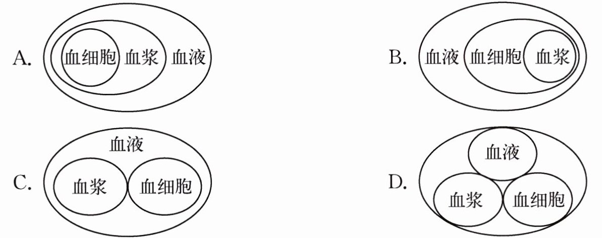 1. 下图中能正确表示血液、血浆、血细胞三个概念之间的关系的是( )。