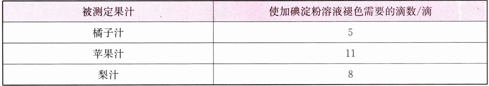 步骤四:取一支洁净、干燥的滴管,分别吸取不同的果汁逐滴滴入加碘淀粉溶液中,边滴边振荡,直到溶液的蓝色完全褪去为止,记录此时所用的滴数;