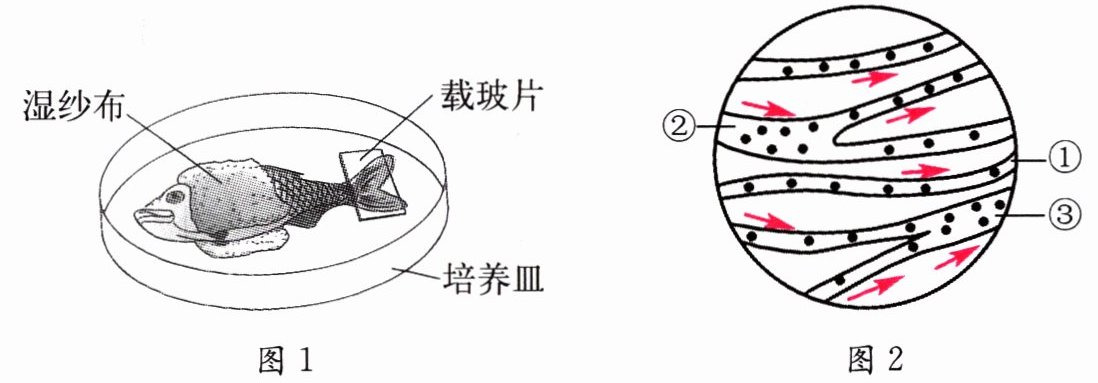 2. 图 1 为“观察小鱼尾鳍内血液流动”的实验准备,图 2 为显微镜下观察到的小鱼尾鳍血液流动情况示意图,其中①~③表示血管,箭头表示血流方向。下列叙述中错误的是(