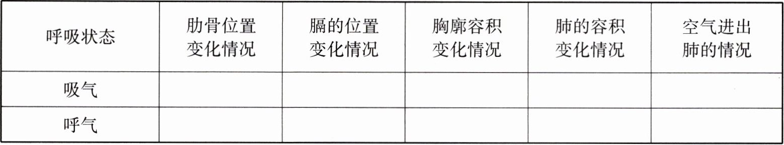 | 呼吸状态 | 肋骨位置变化情况 | 膈的位置变化情况 | 胸廓容积变化情况 | 肺的容积变化情况 | 空气进出肺的情况 |