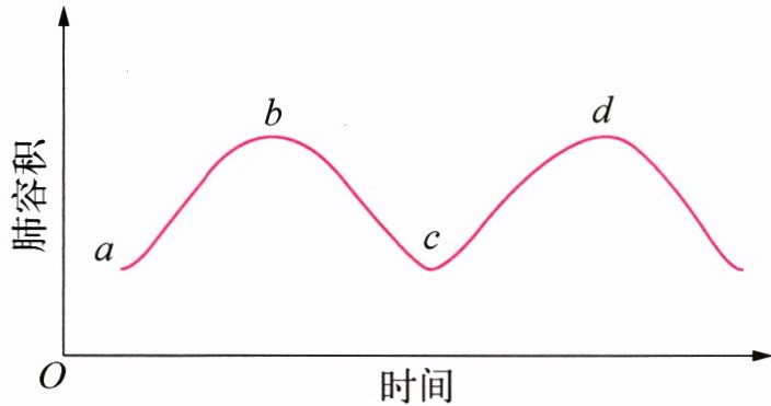 解析 本题运用曲线图表示呼吸时肺容积的变化,主要考查识图能力以及运用比较、分析、综合等方法,进行独立思考和判断,辩证地分析问题的能力。人体在平静状态下呼气时,膈肌和肋间肌舒张,膈顶部上升,肋骨下降,这样胸廓的容积就缩小了,肺随之收缩,肺内气体通过呼吸道排出体外;吸气时则相反。呼气过程,肺的容积由大变小,由图中 bc 段表示;吸气过程,肺的容积由小变大,由图中 ab、cd 段表示。
