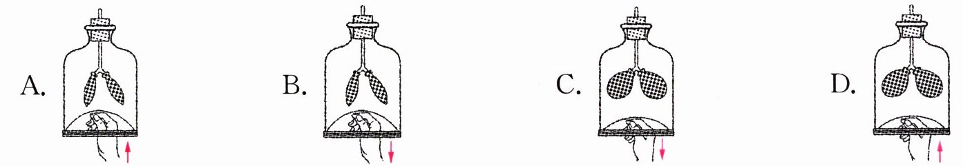11. 下列模拟人体呼吸运动的示意图中,玻璃钟罩代表胸廓,气球代表肺,橡皮膜代表膈。能正确表示呼吸时膈和肺的状态的是(