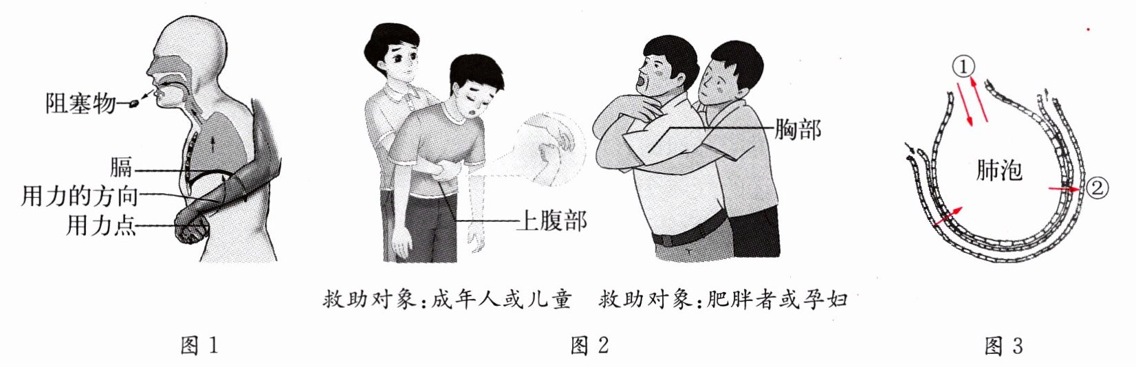 若呼吸道内被异物阻塞,危急情况下可采用海姆立克急救法实施救助。图 1 所示的是海姆立克急救法的原理;图 2 所示的是救助不同对象时,用力点的变化;图 3 为肺泡的气体交换示意图,①和②表示气体交换过程。请据图回答问题。(在方括号中填序号,在横线上填相应的名称)