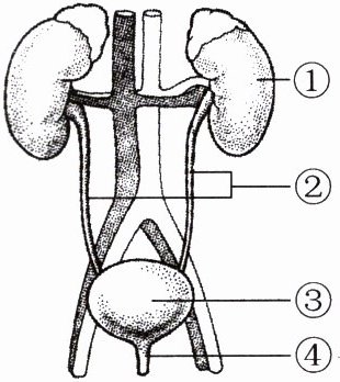 )。① 膀胱 ② 输尿管 ③ 肾脏 ④ 尿道