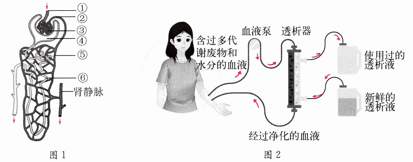 (选填“血浆”或“尿液”)相似。血液透析的核心部分是一种用膜材料制成的透析器,这种膜材料具有半透性,可替代图 1 中③和④的滤过