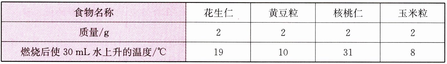 9. 某校生物学兴趣小组的同学探究不同食物所含能量的多少,实验记录如下表所示。下列说法中正确的是(
