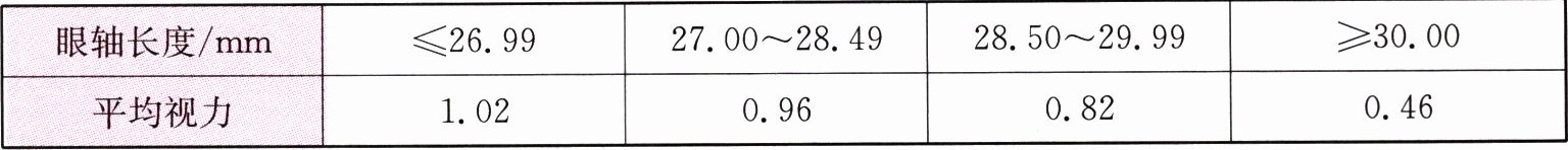 10. 研究人员为了探究眼轴(眼球前后径)长度和视力的关系,检查了 180 位不同近视程度的志愿者的眼轴长度和视力,记录如下表。相关叙述中正确的是(