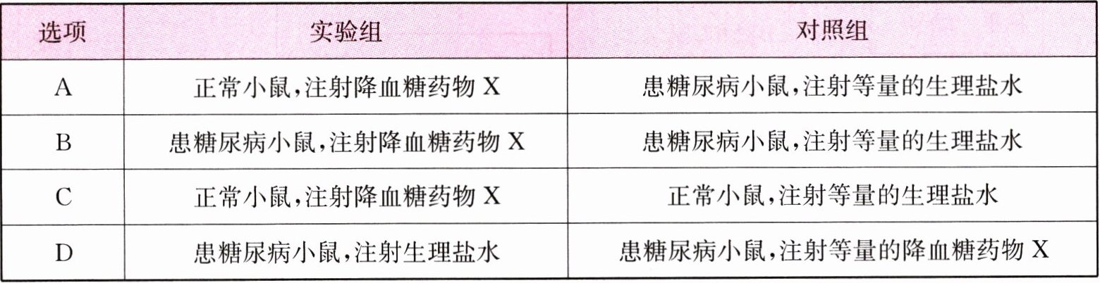 8. 某科研小组为了验证新研制的降血糖药物X能使患糖尿病的小鼠血糖浓度下降,进行了一组实验。下列实验组和对照组小鼠的选择以及操作正确的是(