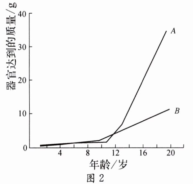(选填“卵巢”或“睾丸”)。(3) 引起图2中卵巢和睾丸快速增长的激素分别是