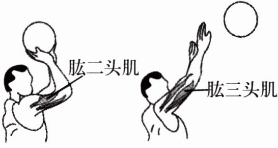 12. 篮球运动是中学生喜爱的运动之一。右下图为双手投篮动作示意图。下列有关叙述中错误的是(