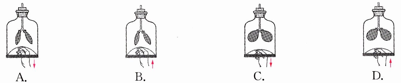 6. 下图中,能正确模拟人体吸气时肺和膈的状态变化情况的是(