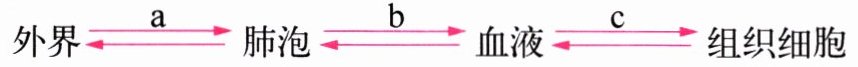 (1)外界气体通过 a 过程到达肺泡,再经过 b 和 c 过程到达组织细胞。图示中向右移动的箭头代表获得