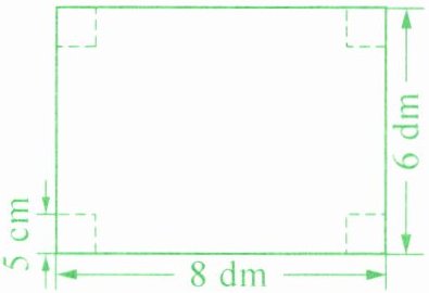 7. 有一张长 8 分米、宽 6 分米的长方形铁皮,在它的四个角各剪去一个边长 5 厘米的正方形(如图),然后焊接成一个无盖的长方体铁皮水槽。这个水槽的容积是多少升?(铁皮的厚度忽略不计)