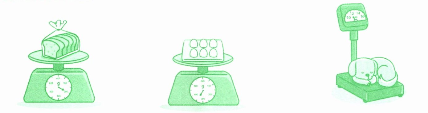 第一个秤指针指向200g,第二个秤指针指向350g,第三个秤指针指向8kg。