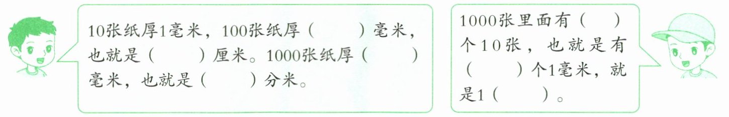 4. 小虎和小军经过测量,知道 10 张纸摞起来的厚度大约是 1 毫米。