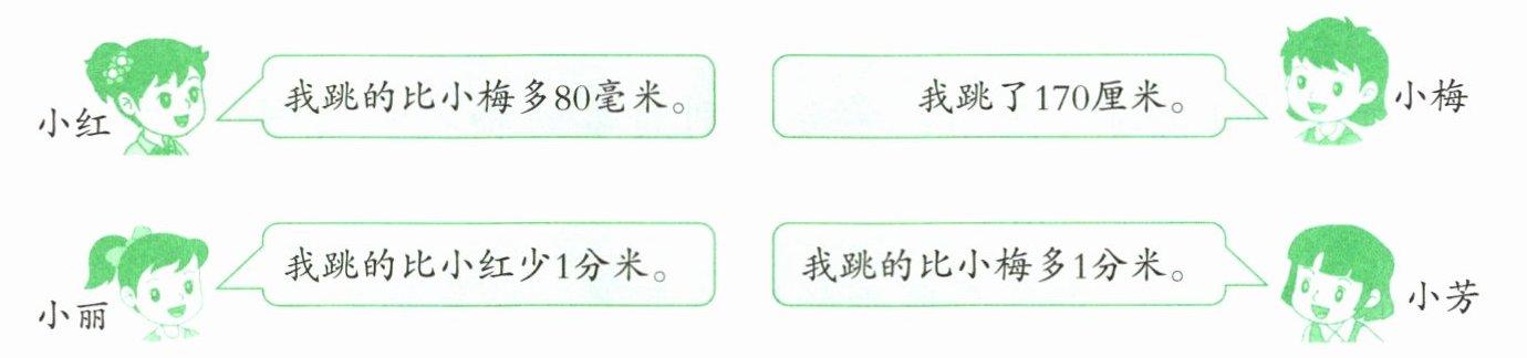 2. 学校举行运动会,小红、小梅、小丽和小芳参加了立定跳远比赛。根据下面的信息,把前三名的名字写在领奖台上。